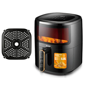 Friteuza cu aer RAF R.5330 este alternativa modernă la prăjirea clasică, folosind tehnologia AirCrisp pentru a reduce grăsimile adăugate cu 70–80%. Preparatele rămân crocante și aromate, fără mirosuri neplăcute și cu un consum redus de ulei.