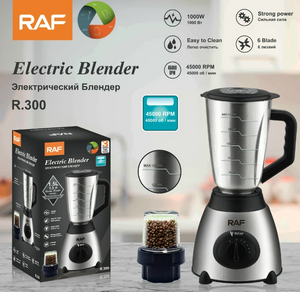 Το Blender Electric 2 σε 1 RAF R.300 είναι μια ευέλικτη και ισχυρή συσκευή για την κουζίνα, εξοπλισμένη με κινητήρα 1000W και ταχύτητα 45000 RPM. Με ένα μπολ από ανοξείδωτο ατσάλι 1,5 λίτρων και έναν ανθεκτικό γυάλινο μύλο masala, αυτό το μπλέντερ είναι τέλειο για smoothies, σέικ και τρίψιμο μπαχαρικών.