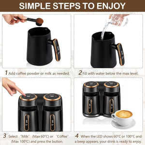 Aparatul este dotat cu două recipiente separate de 300 ml, permițând încălzirea simultană a cafelei și a laptelui sau a apei. Ideal pentru familii, birouri sau momentele când ai musafiri și vrei să prepari mai multe băuturi deodată.